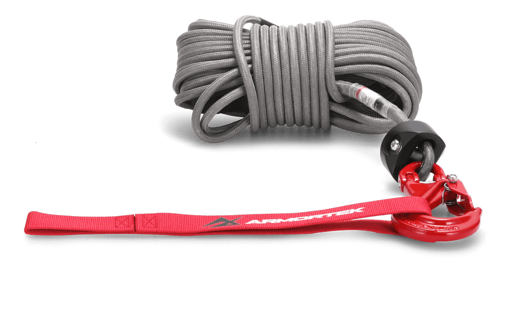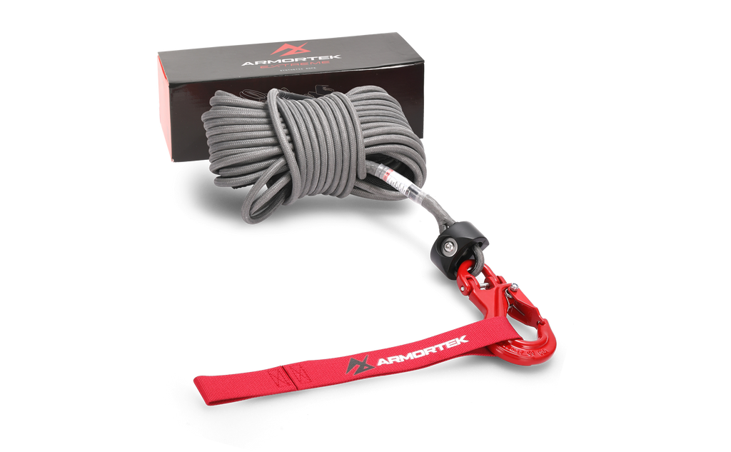 This complete winch rope kit includes a high-strength 9/32" x 50' (7mm x 15m) Armortek Extreme Synthetic Rope, a heavy-duty hook, a rope stopper, and a handsaver strap, giving you everything you need for safe and reliable winching.