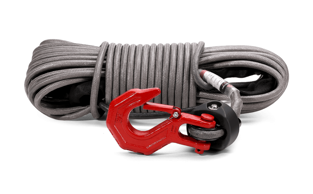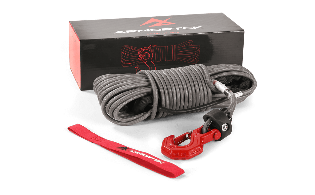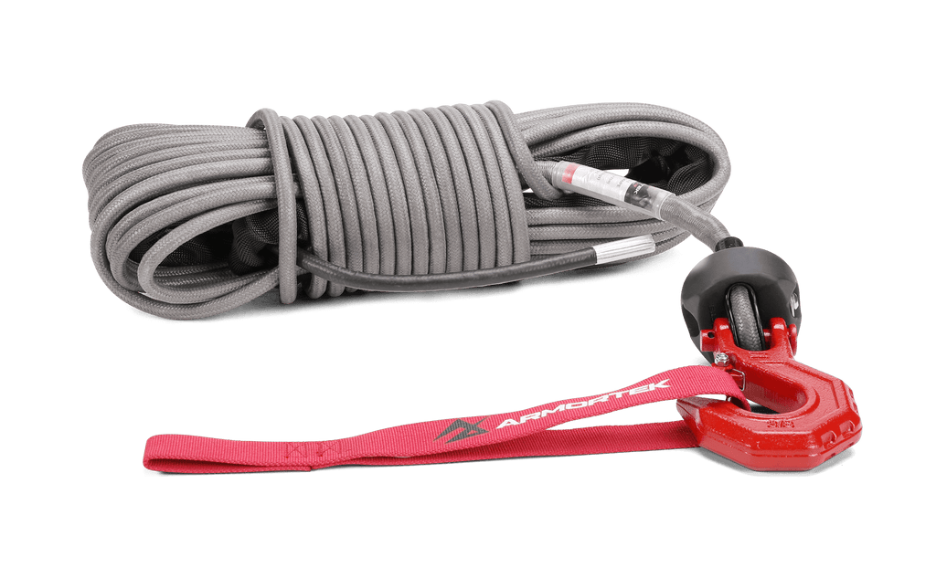 This complete winch rope kit includes a high-strength 3/8" x 82' (9.5mm x 25m) Armortek Extreme Synthetic Rope, a heavy-duty hook, a rope stopper, and a handsaver strap, giving you everything you need for safe and reliable winching.